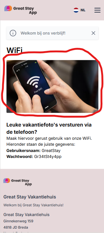 Wil u de afbeelding die er staat verwijderen? Dan kunt u op het kruisje rechtsboven in de afbeelding (niet weergegeven voor gasten in de webapp) drukken. Vergeet niet naderhand op de paarse knop "Opslaan" te drukken!