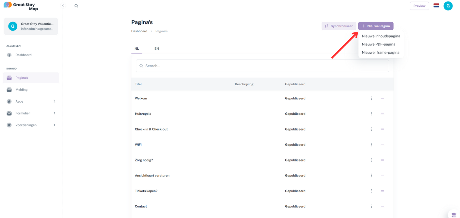 1. Druk rechtsboven op de paarse knop +Nieuwe pagina