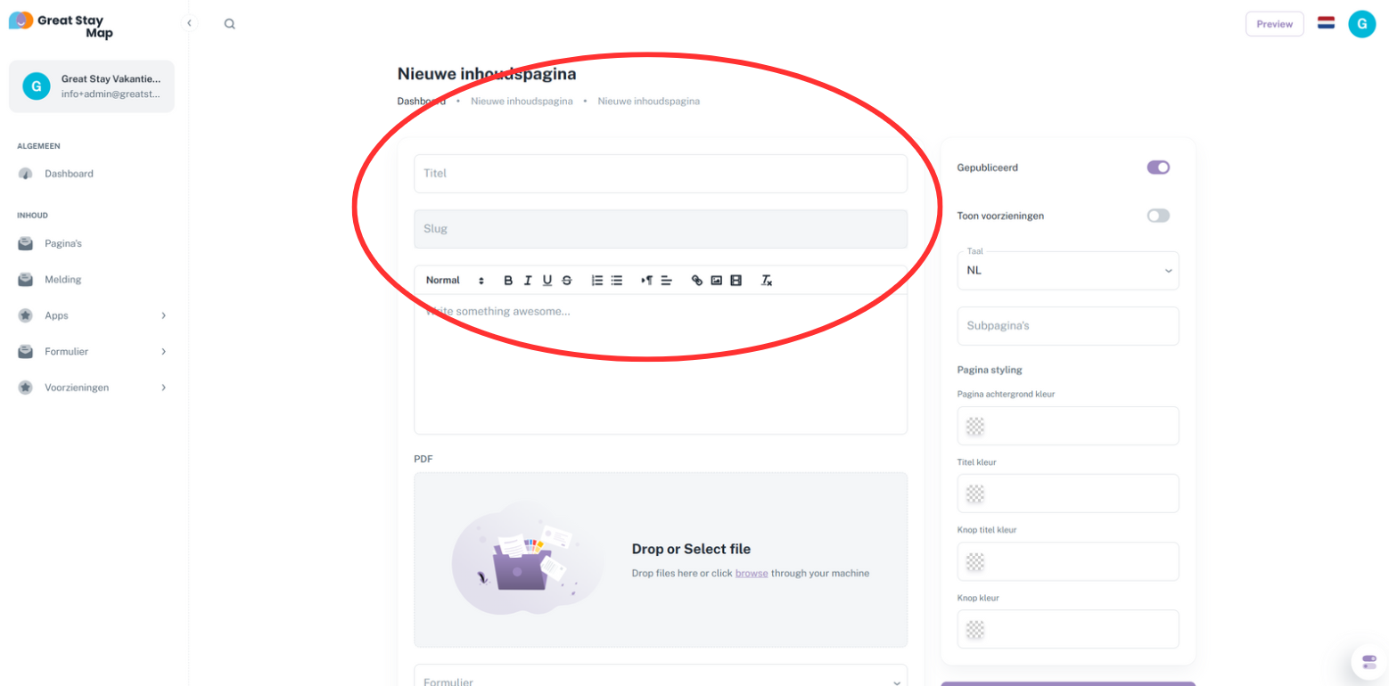 Door op +Nieuwe Pagina te drukken kunt u een pagina aanmaken. Hier kunt u kiezen tussen Inhoudspagina, PDF-pagina en Iframe-pagina. Het enige verschil tussen de content bewerken bij het aanmaken van een pagina en bij het bewerken ervan, is dat enkel bij het aanmaken van een pagina de slug wordt aangemaakt. U kunt niet twee pagina's hebben met dezelfde slug. Als u hierin een (typ)fout in maakt, kunt u dit aanpassen door de pagina te bewerken en helemaal onderaan bij "Slug" de slug aan te passen.