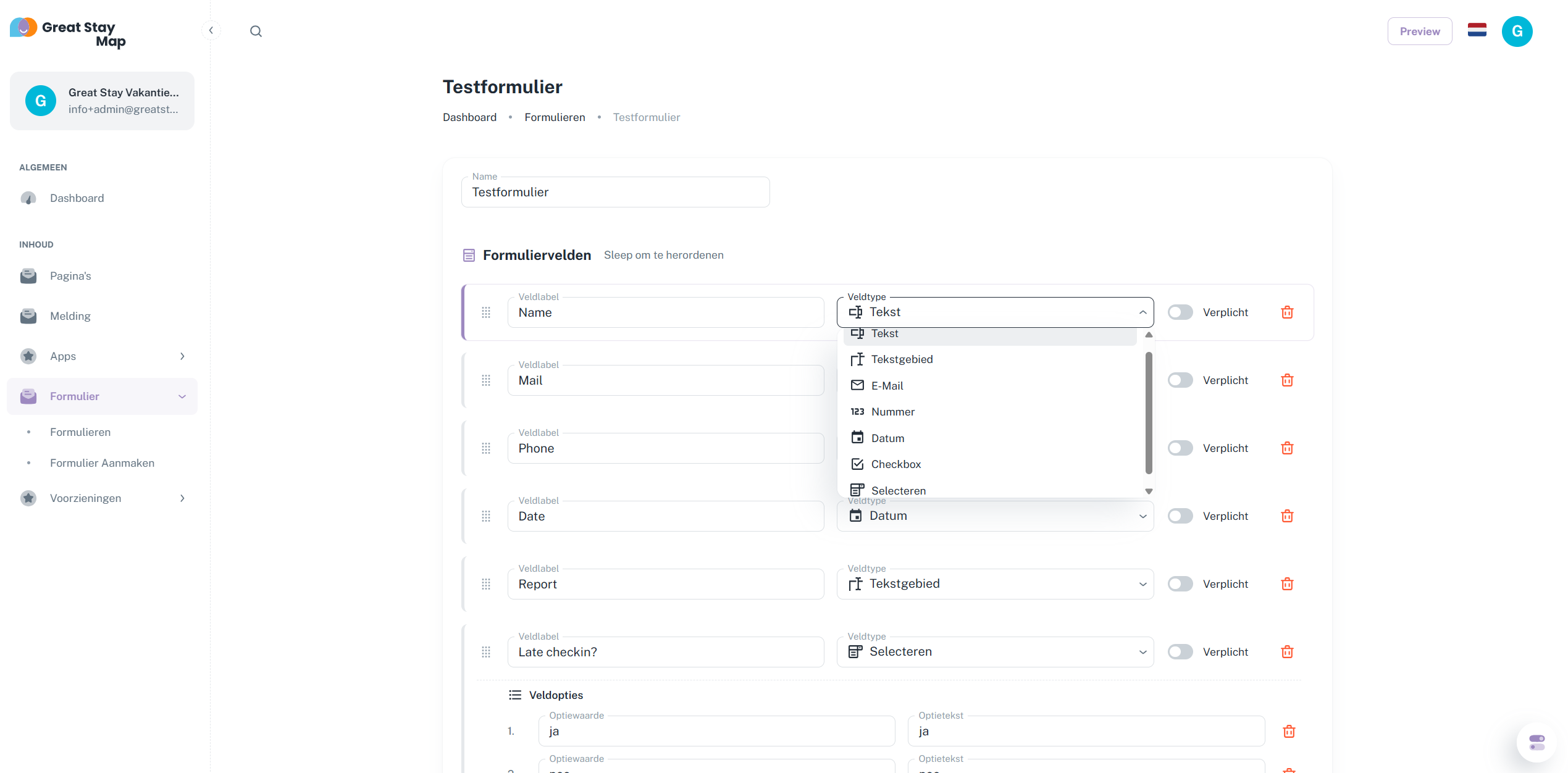 U kunt bij elk veld vrij typen om de naam aan te passen. U kunt op Nieuw veld drukken (onderaan alle velden) om een nieuw veld (vraag) toe te voegen aan uw formulier.