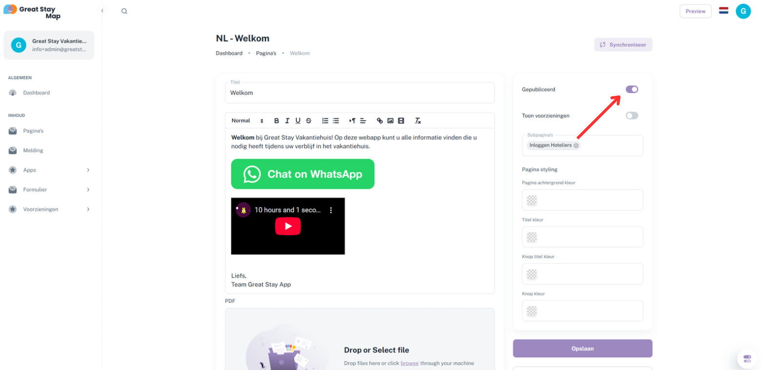 3. Vink aan de rechter bovenkant naast "Gepubliceerd" het balkje aan, zodat het bolletje rechts staat en de kleur in het balkje weer paars is