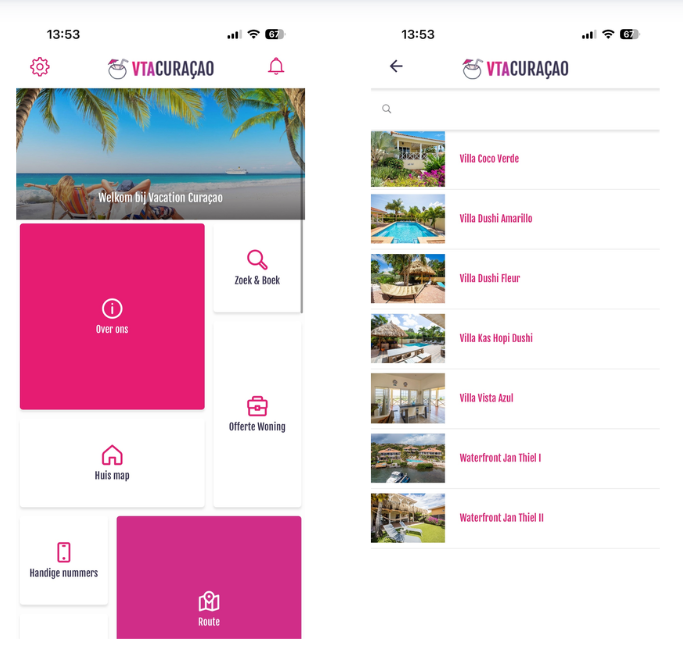 Bovenstaand zijn op de linkerafbeelding alle knoppen ("Over ons", "Zoek en boek", etc.) bouwstenen, en de rechterafbeelding is een voorbeeld van een lijst bouwsteen (onder "Huis map" is een lijst weergegeven waarin allerlei informatie staat per vakantiewoning).