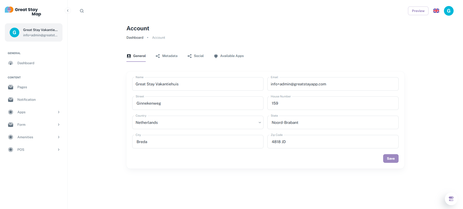 Under "General Information," you can edit the name of your accommodation, your email address, and add all the address information. Above each box, you'll also find the information types you can enter. You don't necessarily have to follow these; you can also access other information by adding other information. This is a matter of testing. Note! Once you enter something, you must enter a blank space to save it. If you don't want to enter anything, we recommend just entering a space. The system will then interpret the space as text, allowing you to save the data. The address will be visible at the bottom of the web app. Your email address will not be visible.