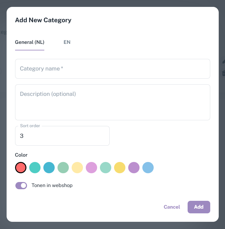 Once My Webshop and Mollie (for payment) have been added, you will see “POS System” at the bottom left of the CMS. First, add categories. To do this, click on Categories, then New Category. Here you can give the category a name, position (how many categories it will be displayed after), colour and, optionally, a description. Once you are satisfied, click Add.