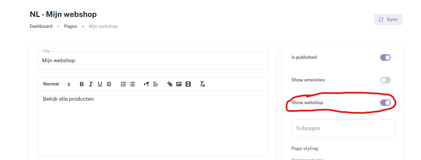 Once all categories and products have been added, you can add the webshop to a page of your choice (or create a new one for this purpose). When editing the page, tick the ‘Show webshop’ option on the right-hand side and save the page. The webshop should now be added to your web app!