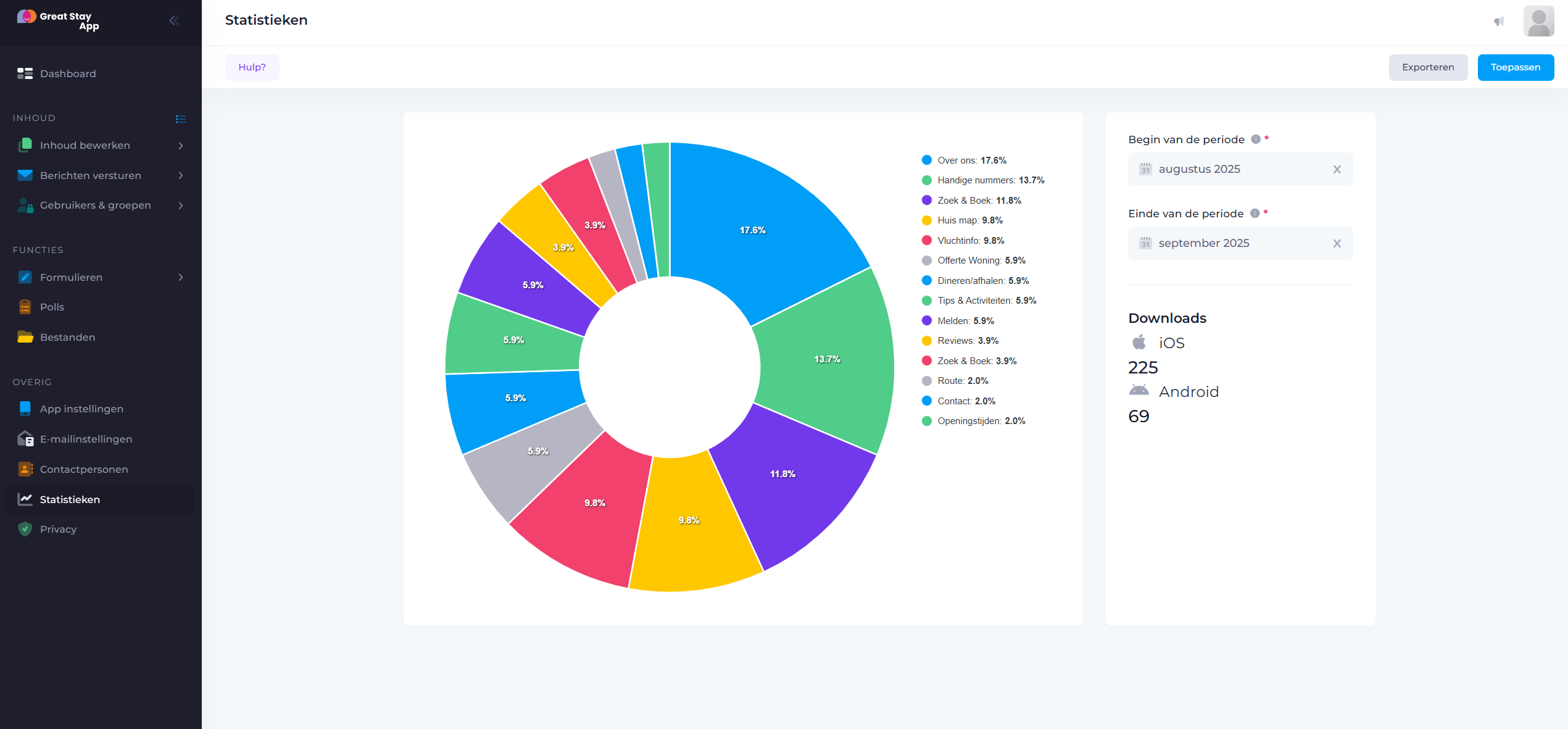 Press “App statistics” at the top of the page to download a more detailed Excel file. This file shows you exactly how often all sections have been opened (per month). You can set the period yourself (start month and last month).