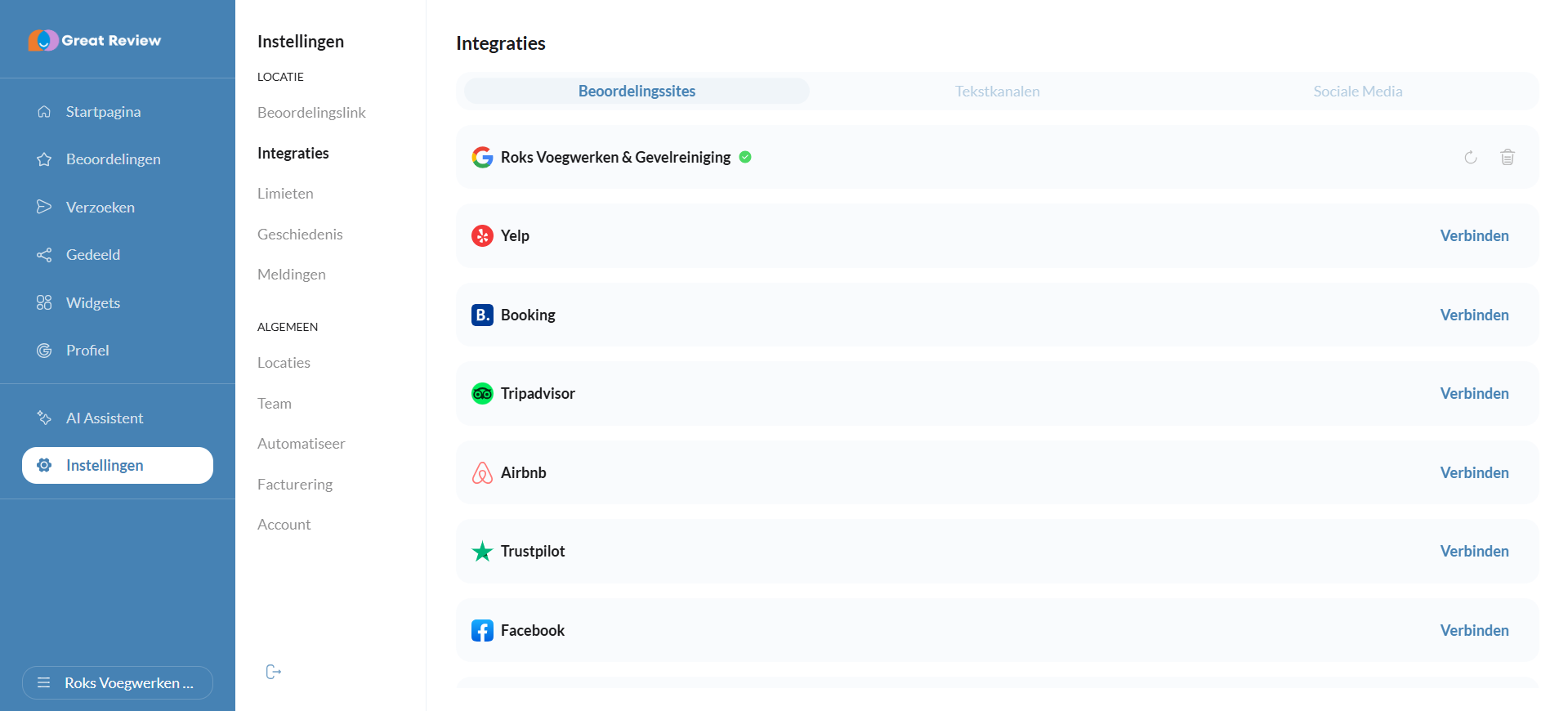 Aan de linkerzijde, onder "instellingen" kan je onder "integraties" een aantal standaard integraties toevoegen. Hij zal automatisch op "beoordelingssites" staan, zoals in de screenshot hieronder. Je kan hier naar beneden scrollen. Onder "Tekstkanalen" kan je email, SMS en WhatsApp (als je Facebook hebt gekoppeld) koppelen, en onder Sociale Media de bedrijfsbeoordeling van Instagram en Facebook.