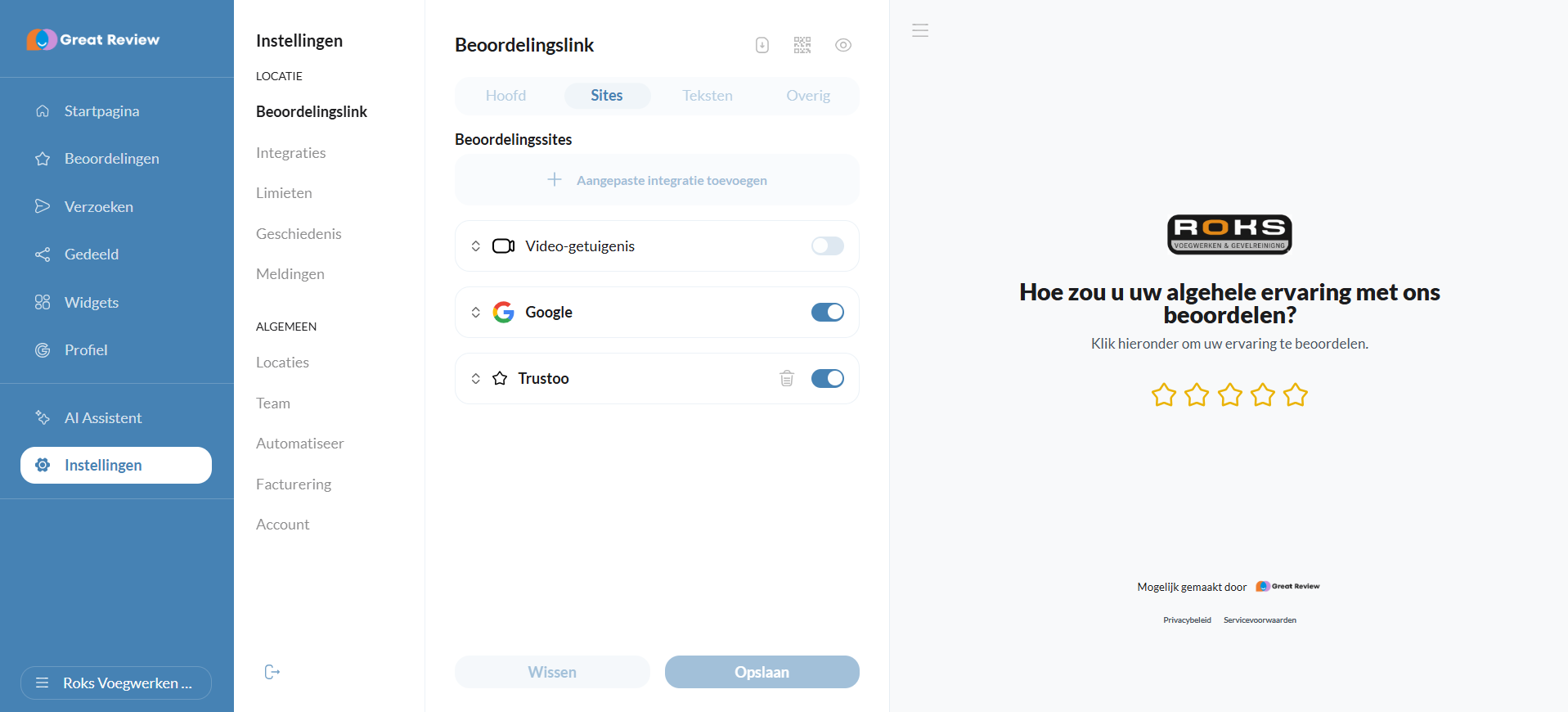 Vervolgens is het de bedoeling dat je de beoordelingsintegratie toevoegt aan de review tool. Dit moet onder "Instellingen" en dan "Beoordelingslink" (zie onderstaande screenshot). Daar staan alle integraties in een lijst, waar je je integraties aan- of uit kan vinken. Als ze aangevinkt staan, komen ze terecht in de review tool!